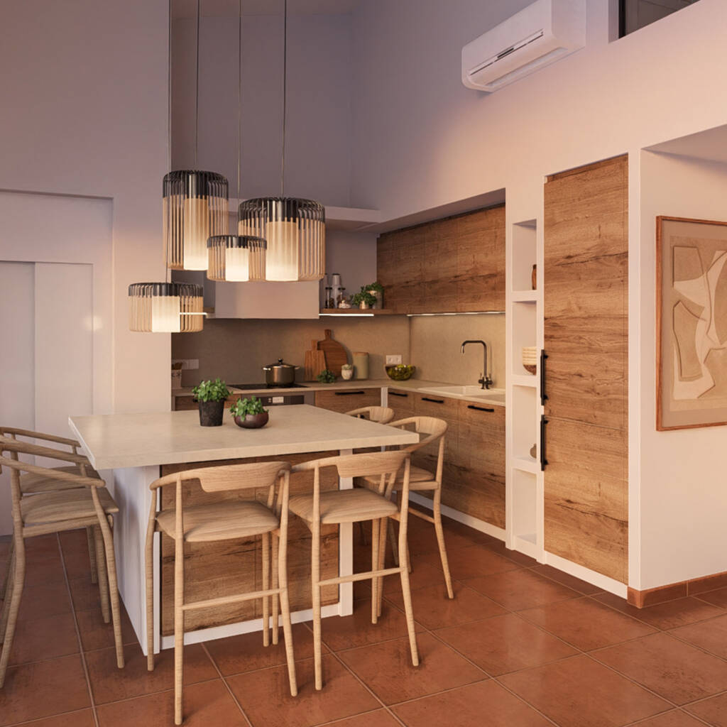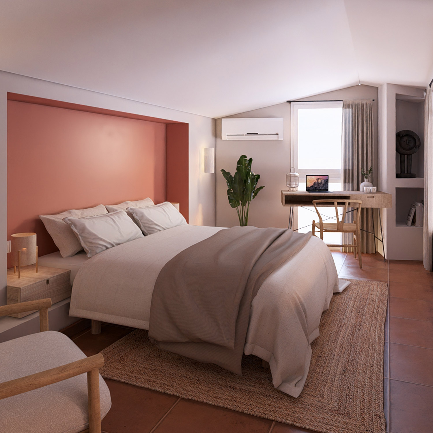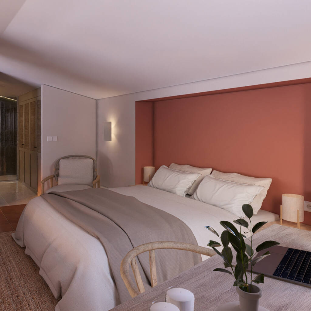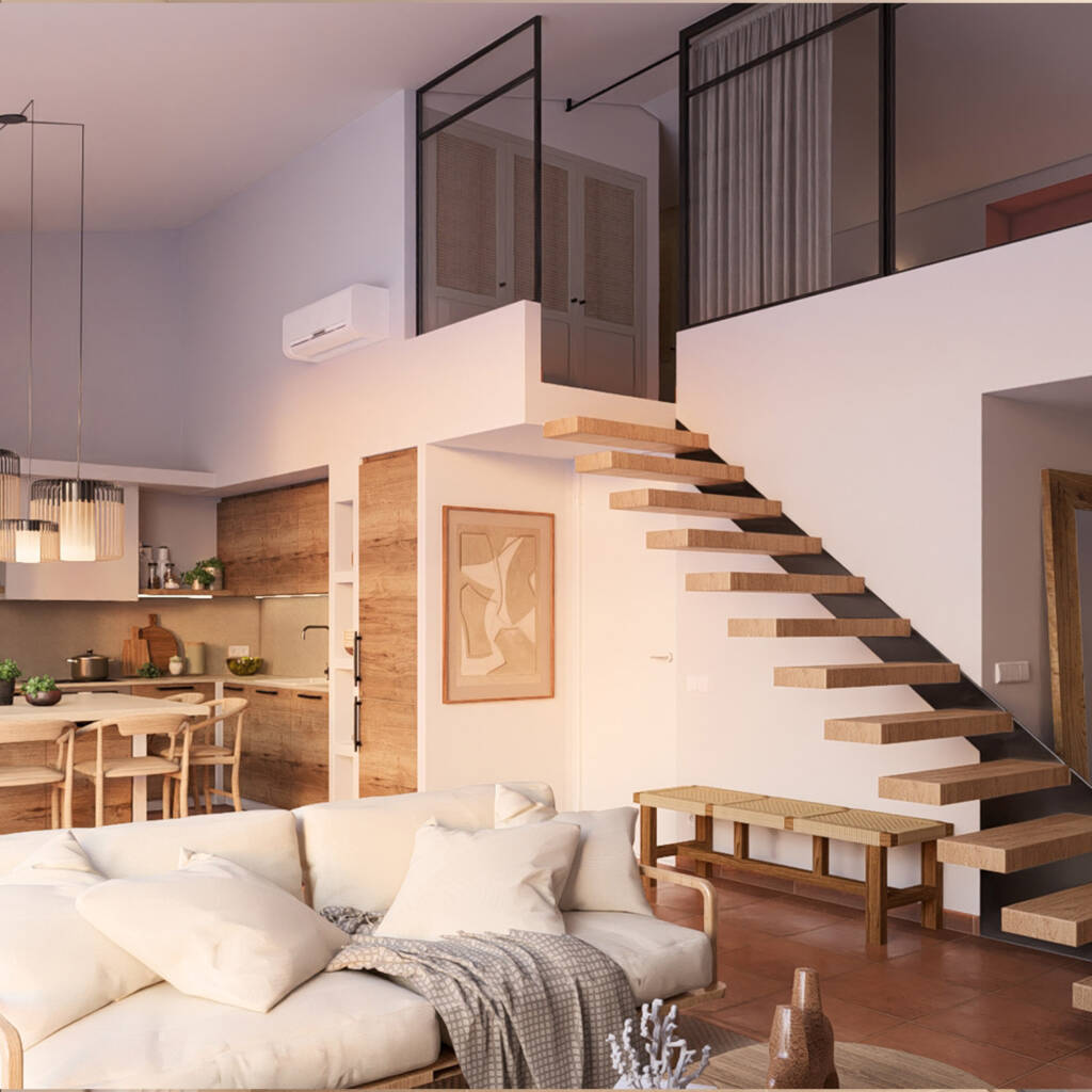 Unas escaleras flotantes de estructura metálica, revestidas en madera, comunican con el altillo de la habitación principal, donde se hizo una intervención para ampliar el espacio, integrando la camadentro de la pared. Se usaron acabados y colores mediterráneoscomo el terracotta, cerámica, madera en un refugio que insipiratranquilidad.